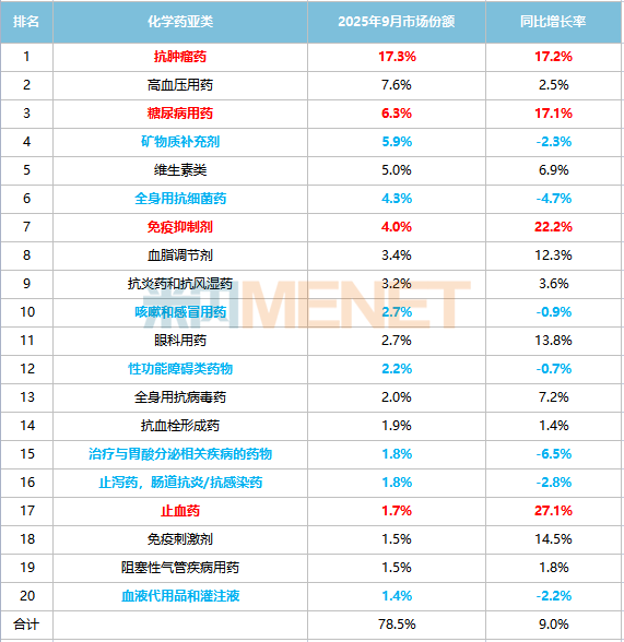 2025年9月,化学药TOP20品类销售规模占78.5%的份额,销售份额较上月上升1个百分点,从增长率来看,同环比均有上升,环比上升了8%,同比有9%的增长。