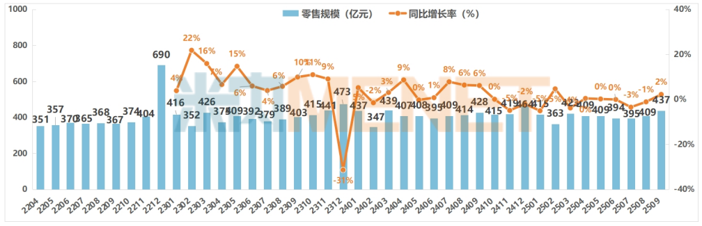 2025年9月,中国实体药店药品零售规模为437亿元,销售较上月增长6.9%,与去年同期规模相比,也有2.2%的涨幅,主要还是依靠创新药拉动了药品市场的增长。