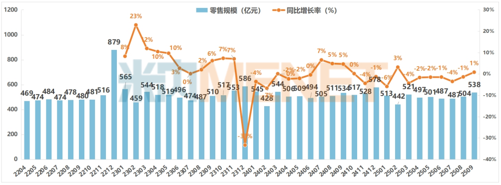总体分析:2025年9月中国实体药店零售规模(药品+非药)为538亿元,同环比均有上升,行业震荡调整向好