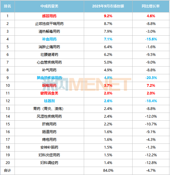 2025年9月,中成药TOP20品类份额为84.0%,市场集中度较上月微降0.1个百分点。从销售规模上看,销售规模较上月上升了10.3%,与同期相比,则下降了4.7%。