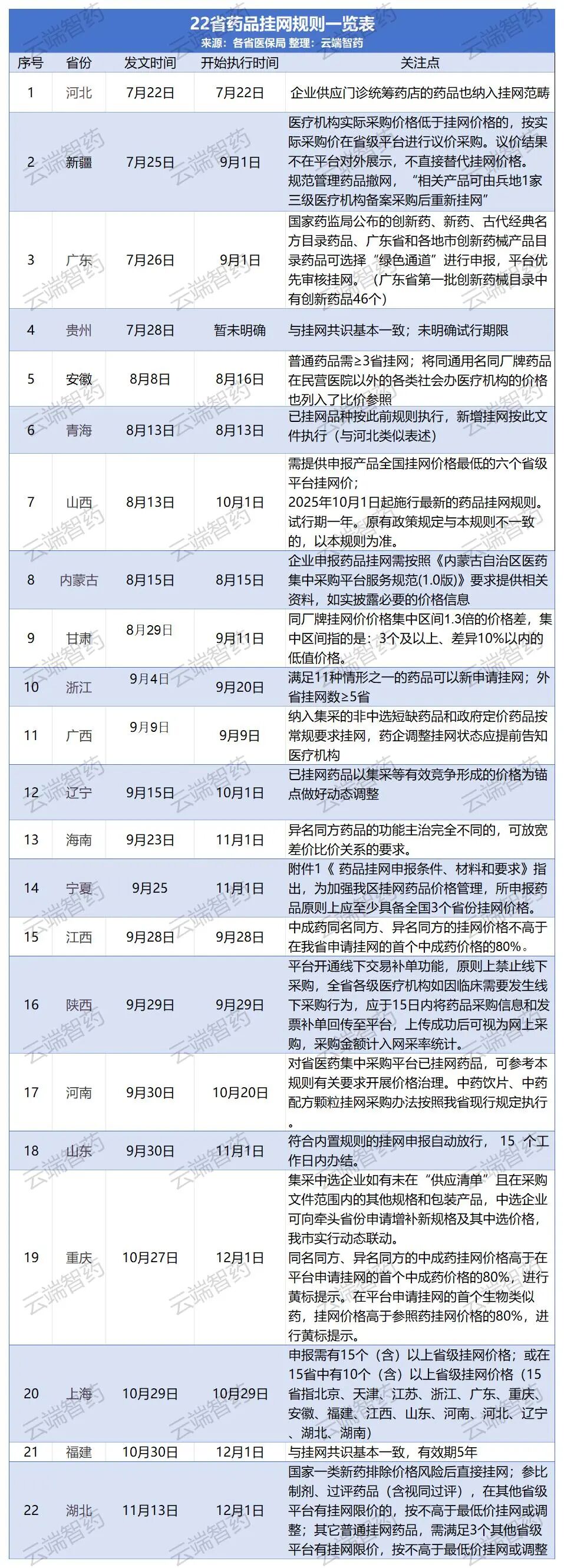 目前,全有已有22省发布正式药品挂网规则文件:河北、新疆、广东、贵州、安徽、青海、山西、内蒙古、甘肃、浙江、广西、辽宁、海南、宁夏、江西、陕西、河南、山东、重庆、上海、福建挂网规则已经成文。其余各省均发出征求意见稿并完成了意见征稿。