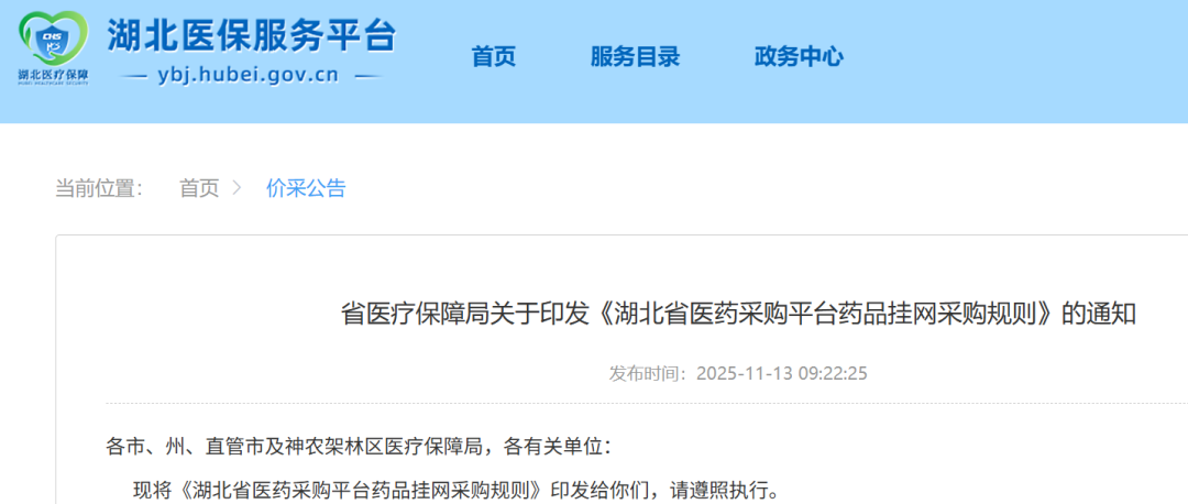 编辑说:11月13日,湖北医保服务平台发出省医疗保障局关于印发《湖北省医药采购平台药品挂网采购规则》的通知,公布该省药品挂网采购规则,自2025年12月1日起执行。