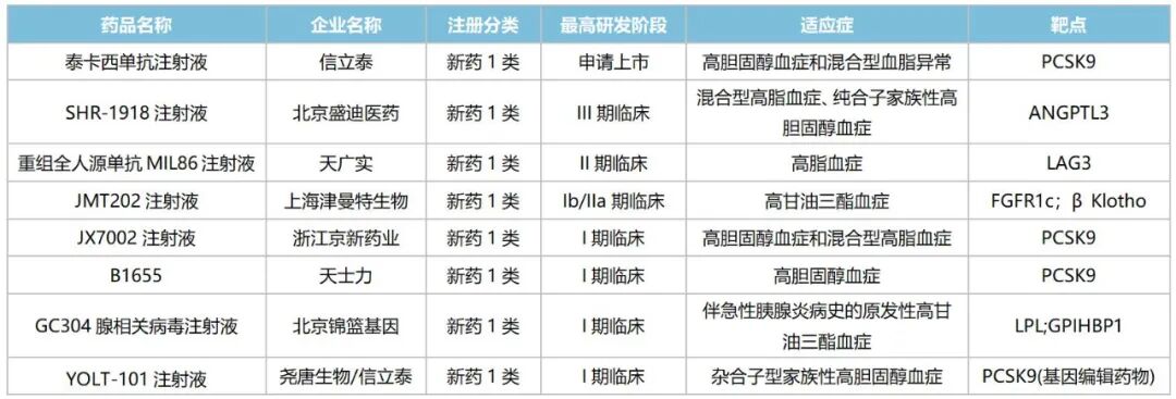 在血脂调节剂生物药新药研发方面,据不完全统计,国内有8款国产1类新药处于I期临床及以上阶段,其中信立泰的泰卡西单抗注射液已于2025年9月提交NDA,有望于明年获批上市;恒瑞医药的SHR-1918注射液处于III期临床,这是一款血管生成素样蛋白3(ANGPTL3)单抗,可用于治疗混合型高脂血症以及罕见遗传病纯合子家族性高胆固醇血症。