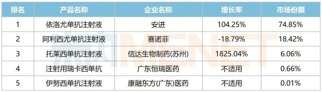 在2025年上半年血脂调节剂生物药TOP5品牌中,安进的依洛尤单抗注射液以超14亿元领跑,赛诺菲的阿利西尤单抗注射液以超3亿元紧接其后,信达生物的托莱西单抗注射液以超1亿元排位第三。