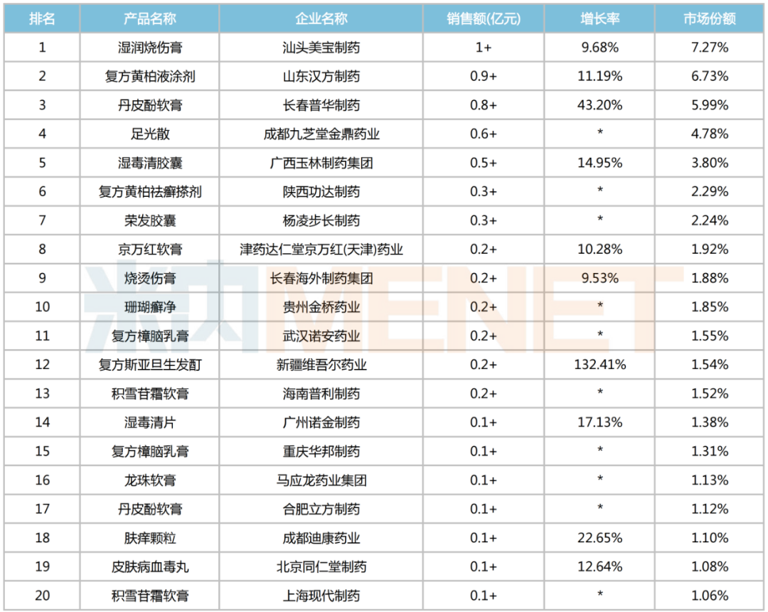 9个皮肤科独家中成药成功登榜,包括汕头美宝制药的湿润烧伤膏、汉方制药的复方黄柏液涂剂、康臣药业的湿毒清胶囊、步长制药的荣发胶囊、津药达仁堂的京万红软膏、人福医药的复方斯亚旦生发酊、马应龙药业的龙珠软膏等。