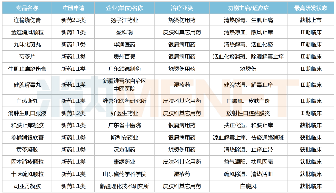 2020年以来,有14款皮肤科中药新药先后获批临床,包括12款1.1类新药、1款1.2类新药和1款2.3类新药。其中,6款1.1类新药盈科瑞的金连消风颗粒(荨麻疹)、华润医药的九味化斑丸(银屑病)、贵州百灵的芍苓片(银屑病)、广东颂德制药的生肌止痛烧伤膏(深Ⅱ度烧伤)、新疆维吾尔自治区中医医院的健脾解毒丸(银屑病)和维吾尔医药研究所的白热斯丸(白癜风)均已步入Ⅱ期临床;扬子江药业的2.3类新药连榆烧伤膏(糖尿病足溃疡疮面)为新增适应症,目前正处Ⅱ期临床试验阶段。