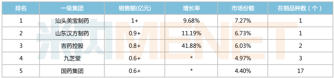 2025H1中国零售药店终端皮肤科中成药一级集团格局中,TOP5一级集团分别为汕头美宝制药、汉方制药、吉药控股、九芝堂和国药集团。其中,汕头美宝制药市场份额超7%,吉药控股的销售额增速达41.88%。