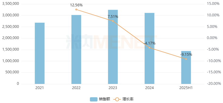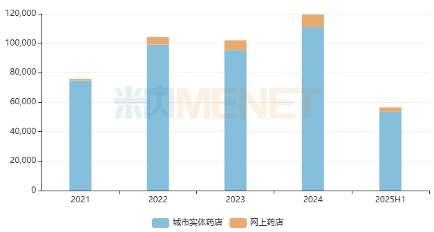 米内网数据显示,清热解毒中成药在近年中国三大终端六大市场(统计范围详见本文末)均保持300亿元以上的销售规模,2025年上半年同比有所下滑。从细分渠道来看,院内市场(公立医院终端+公立基层医疗终端)和院外市场(零售药店:城市实体药店+网上药店)均有下滑。