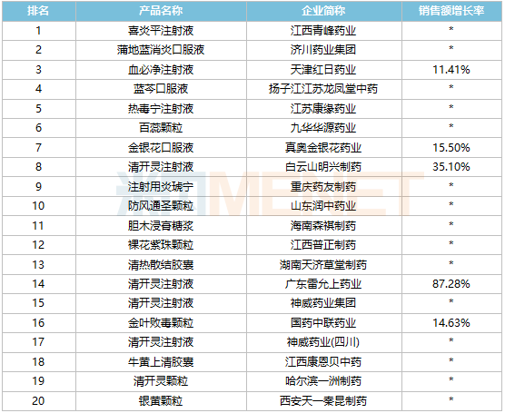 品牌TOP20中,青峰医药的喜炎平注射液、济川药业集团的蒲地蓝消炎口服液、天津红日药业的血必净注射液位居前三,广东雷允上药业的清开灵注射液、神威药业(四川)的清开灵注射液是新上榜品牌。