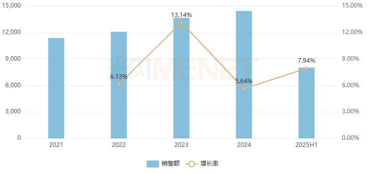 复方木尼孜其颗粒在近年中国三大终端六大市场(统计范围见文末)销售规模超过1亿元,2025年上半年同比增长7.94%。