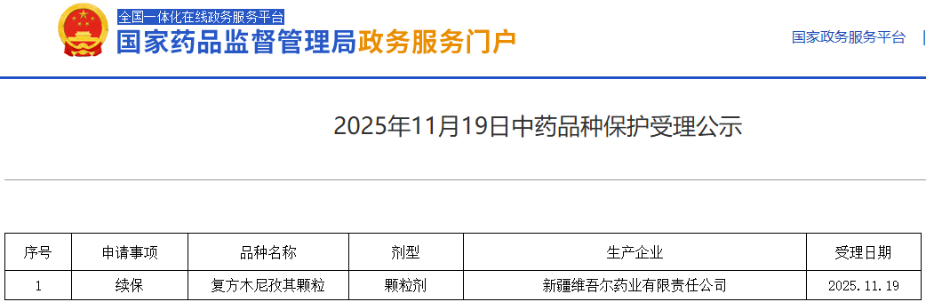 编辑说:11月19日,国家药监局官网显示,复方木尼孜其颗粒申请中药品种保护续保获受理。该产品是人福医药旗下子公司的独家品种,米内网数据显示,复方木尼孜其颗粒在近年中国三大终端六大市场销售规模超过1亿元,2025年上半年同比增长7.94%。同日,宜昌人福药业的二甲磺酸利右苯丙胺胶囊以仿制3类报产获CDE受理,该产品国内暂无企业获批。