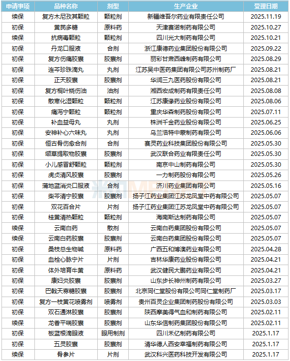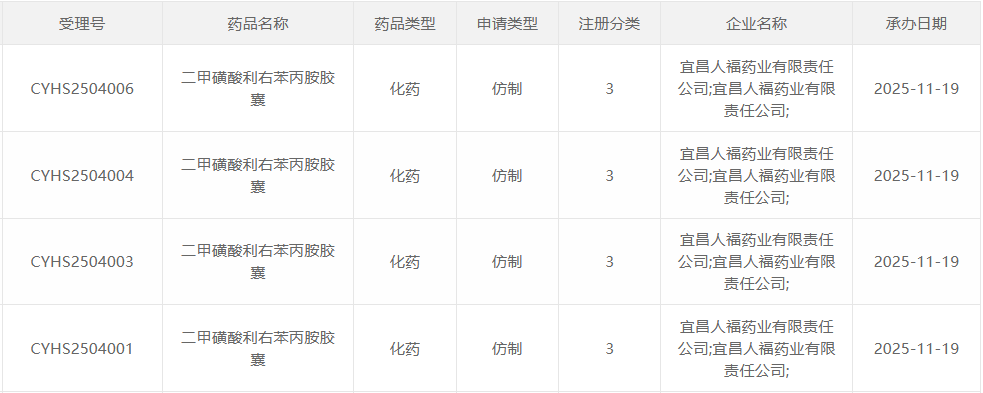11月19日,国家药监局官网显示,复方木尼孜其颗粒申请中药品种保护续保获受理。该产品是人福医药旗下子公司的独家品种,米内网数据显示,复方木尼孜其颗粒在近年中国三大终端六大市场销售规模超过1亿元,2025年上半年同比增长7.94%。同日,宜昌人福药业的二甲磺酸利右苯丙胺胶囊以仿制3类报产获CDE受理,该产品国内暂无企业获批。