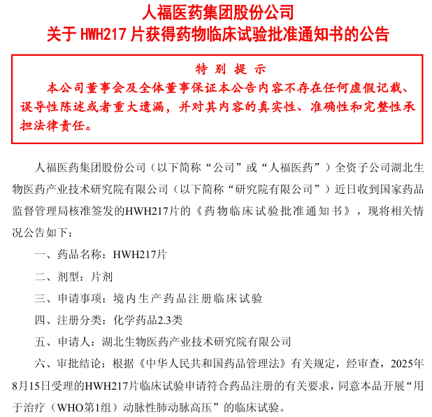 近期,人福医药新品公告捷报频传。公司控股子公司宜昌人福药业的化药1类新药HW231019片进入II期临床试验研究;公司全资子公司湖北生物医药产业技术研究院的化药2.3类新药HWH217片获批临床,拟用于治疗(WHO第1组)动脉性肺动脉高压。