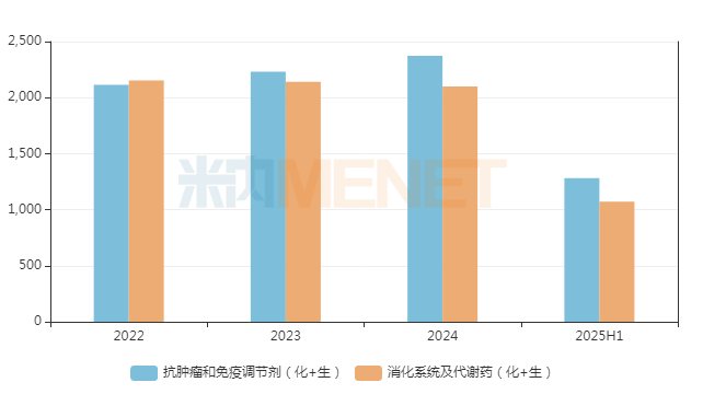 在中国三大终端六大市场(统计范围详见本文末),抗肿瘤和免疫调节剂(化+生)、消化系统及代谢药(化+生)2024年销售额分别超2300亿元和2100亿元;2025H1各收获超1200亿元和1000亿元,一级集团销售额格局方面,作为正大天晴药业的主要控股集团,正大制药分别位居两大品类市场的TOP6和TOP4之列。