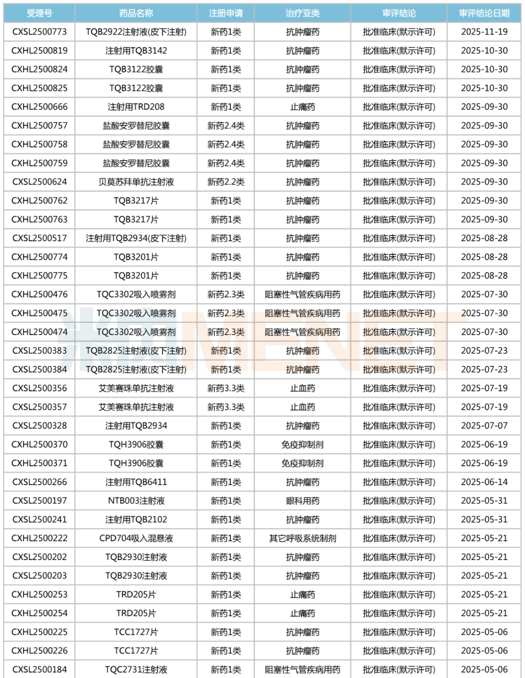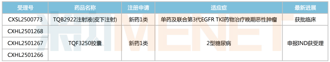 TQB2922注射液(皮下注射)属于靶向EGFR/c-Met人源化双抗,为正大天晴药业的1类创新药,拟用于单药及联合第三代EGFR TKI药物治疗晚期恶性肿瘤。据悉,该新药的临床申请(CXSL2500773)于2025年9月获得CDE承办,随后于今年11月获得临床试验默示许可。