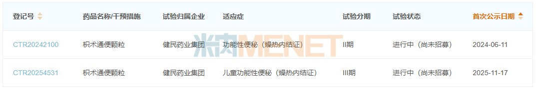 据公司公告显示,枳术通便颗粒处方来源于湖北省中医院儿科专家陈陶后教授治疗小儿便秘的临床经验方,功能主治为清润肠燥,用于小儿燥热内结便秘的治疗。健民药业在2023年5月提交了枳术通便颗粒中药1.1类新药临床申请并于同年7月获批,2024年6月启动功能性便秘(燥热内结证)II期临床,2025年11月启动儿童功能性便秘(燥热内结证)III期临床。