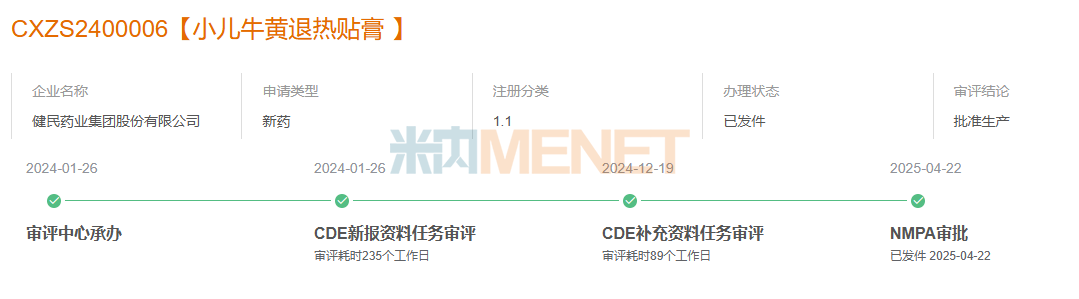 今年4月,健民药业再有中药1.1类新药获批,小儿牛黄退热贴膏处方源自全国名中医的临床经验方,用于小儿急性上呼吸道感染风热证所致的发热(38.5℃及以下)。该新药早前已进入2025年国谈通过形式审查的药品名单,能否顺利获得政策红利,有待官宣。