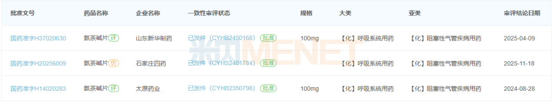目前,氨茶碱片有175家企业拥有生产批文,仅太原药业、山东新华制药、石家庄四药3家企业过评,天津力生制药、石药欧意药业、烟台鲁银药业3家企业的一致性评价补充申请在审,哈尔滨三联药业以仿制3类报产在审,获批后视同过评。