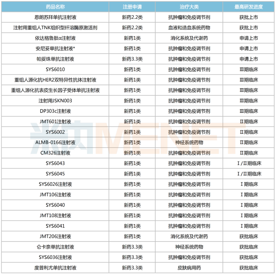 22款获批临床的新药包含17款1类新药、2款2.2类新药和3款3.3类新药。其中,SYS6010(非小细胞肺癌)、重组人源化抗HER2双特异性抗体注射液(乳腺癌)、重组人源化抗表皮生长因子受体单抗注射液(结直肠癌、非小细胞肺癌)、注射用JSKN003(乳腺癌、卵巢癌)、DP303c注射液(乳腺癌)等已进入Ⅲ期临床,申报NDA可期。