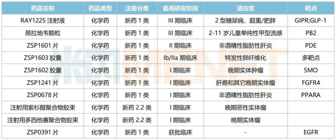 此外,10款新药(8款1类新药)在国内处于获批临床及以上阶段,均为小分子化学药,覆盖消化代谢、呼吸系统、抗感染、抗肿瘤等治疗领域。