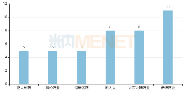 从集团层面来看,倍特药业过评产品最多,有11个,其次是北京北陆药业和司太立各有8个。此外,恒瑞医药、科伦药业和正大制药各有5个。