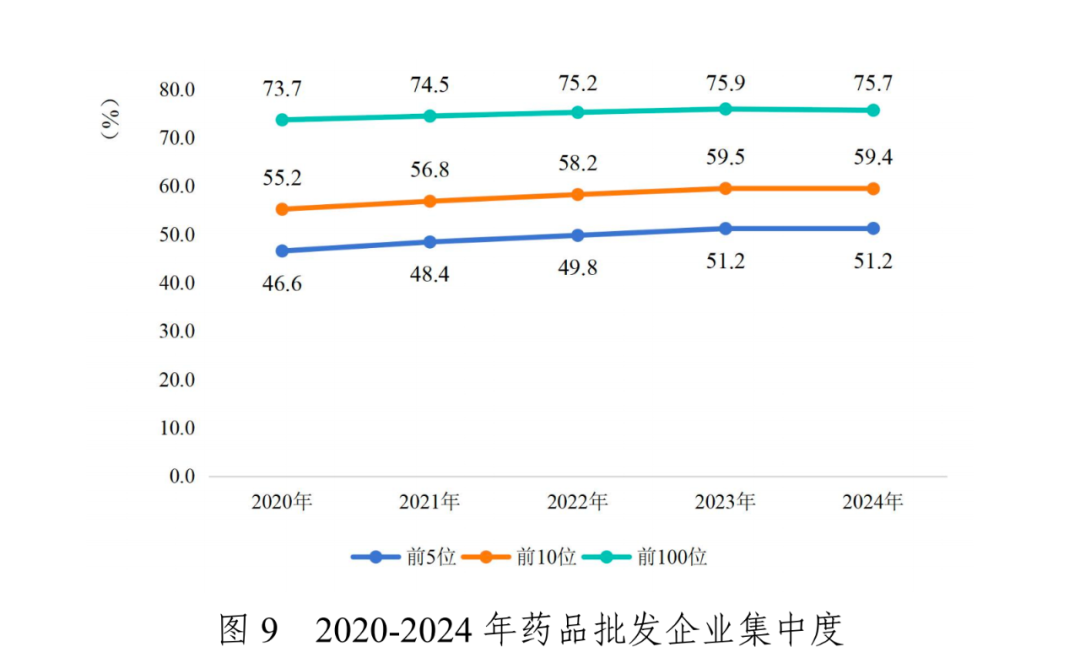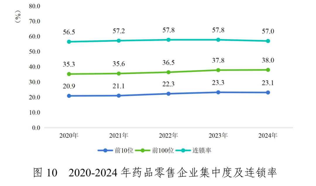 从市场占有率看,2024年,我国前5家全国性药品批发企业主营业务收入占同期全国医药市场总规模的51.2%,与上年持平;前10位占比59.4%;前100位占比75.7%。药品零售前10位企业年销售总额1504亿元,占全国药品零售市场总额23.1%;前100位年销售总额2470亿元,占比38.0%。零售连锁率为57.0%。