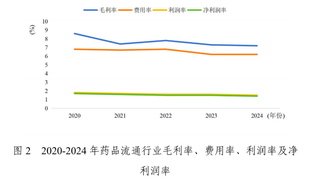 从企业净利润来看,净利润率仅1.4%——2024年,全国药品流通直报企业主营业务收入22431亿元(不含税),扣除不可比因素同比增长0.8%,约占全国七大类医药商品销售总额的86%;利润总额468亿元;平均毛利率7.2%;平均费用率6.2%;平均利润率1.5%;净利润率1.4%。