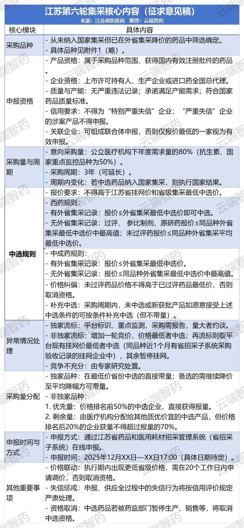编辑说:12月10日,江苏省医保局发布《关于公开征求省第六轮药品集中带量采购方案意见的公告》,拟开展第六轮集采,向社会征求意见,征求意见时间:2025年12月10日- 12月14日。