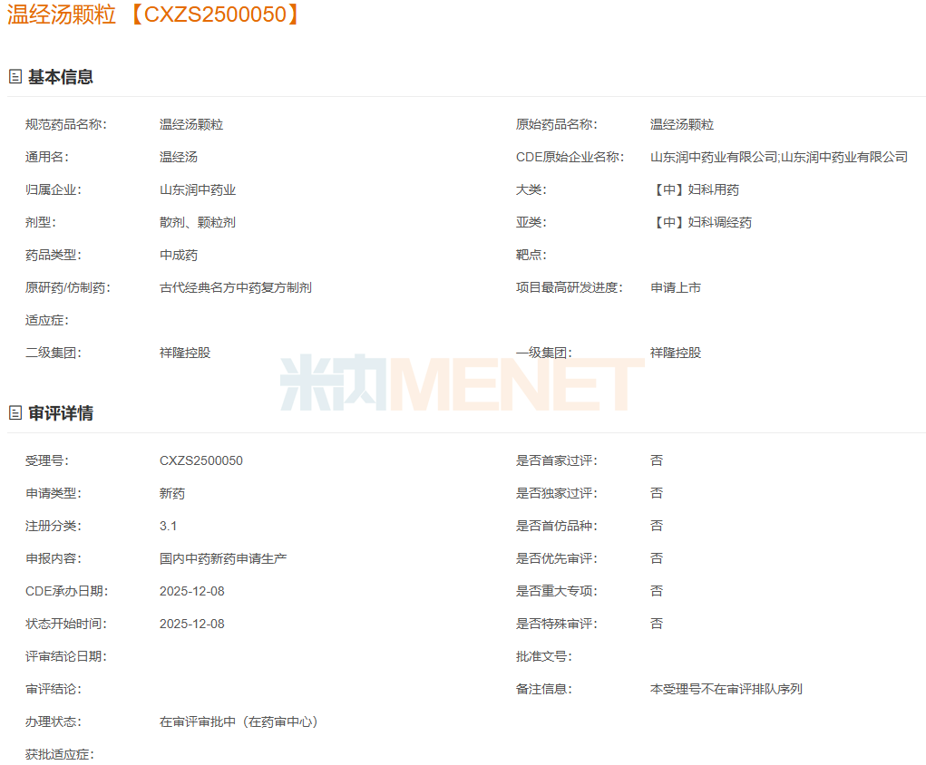 编辑说:日前,CDE官网显示,山东润中药业的温经汤颗粒报产获受理,在此之前,健民集团发布公告,公司的中药1.1类新药益母妇炎颗粒获批临床。今年以来,妇科中成药新药已有4款产品获批上市,5款产品报产在审,8款1类新药获批临床。米内网数据显示,妇科中成药在近年中国零售药店终端市场均超过50亿元销售规模,2025年上半年同比略有下滑。从TOP20来看,城市实体药店11个独家产品霸屏,千金、步长、同仁堂上榜;网上药店“销冠”易主,独家产品大涨231%,3个品牌“6连涨”。