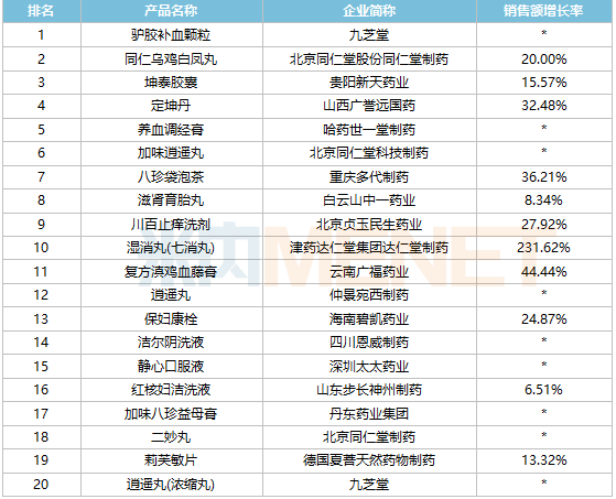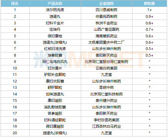 品牌TOP20中,四川恩威制药的洁尔阴洗液是唯一一个销售额超过1亿元品牌,株洲千金药业的妇科千金片晋身前三;太极集团重庆中药二厂的逍遥丸(浓缩丸)、北京同仁堂股份同仁堂制药的同仁乌鸡白凤丸、贵州健兴药业的康妇凝胶均有双位数增速。