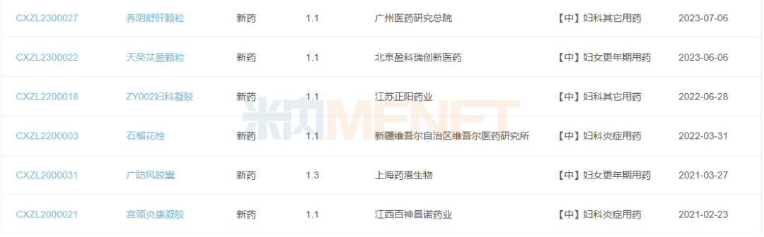 2021年至今,妇科中成药有19款1类新药获批临床,涵盖妇科调经药、妇女更年期用药、乳腺增生药等治疗亚类。其中,广东方盛融科药业的妇科止血消痛颗粒和紫英颗粒、株洲千金药业的活血消异颗粒、漳州片仔癀药业的养巢颗粒等8款产品均在今年获批。