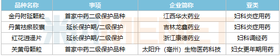 今年以来,国家药监局发布的中药保护品种公告中,有4款妇科中成药在列,其中3款为独家产品,江西华太药业的金丹附延颗粒、太阳升(亳州)生物医药科技的关黄母颗粒均为首家中药二级保护品种。