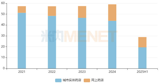 米内网数据显示,妇科中成药在近年中国零售药店(城市实体药店和网上药店)终端市场均超过50亿元销售规模,2025年上半年同比略有下滑。从细分渠道来看,城市实体药店是主力销售渠道,网上药店则保持快速增长。