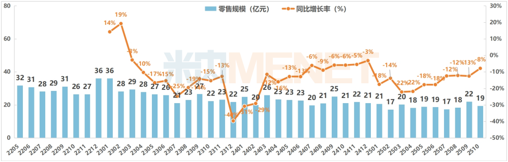 2025年10月全国实体药店保健品零售规模为19亿元,较上月规模下降了11.3%,与去年同期相比,有7.9%的降幅,降幅已缩窄至10%以内。