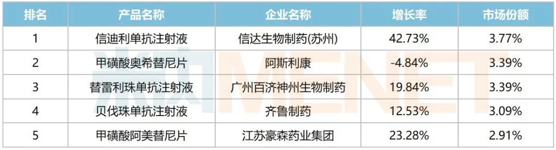 在2025年上半年抗肿瘤药(化药+生物药)TOP5品牌中,信达生物的信迪利单抗注射液以超32亿元排在首位,同比增长约43%;阿斯利康的甲磺酸奥希替尼片、百济神州的替雷利珠单抗注射液分别位列第二、第三,销售额均超过28亿元。