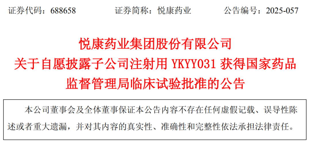注射用YKYY031的临床申请于2025年11月获得CDE承办受理,12月即获得临床试验默示许可,适应症为晚期实体瘤。从申报临床到获批临床,仅历时约1个月。