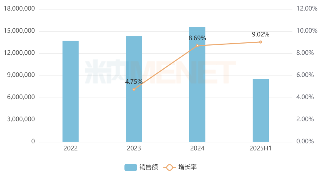 米内网数据显示,近年来中国三大终端六大市场抗肿瘤药(化药+生物药)销售额呈逐年上涨态势,2024年超过1500亿元,同比增长约8.7%,2025年上半年超过800亿元,同比增长约9%。