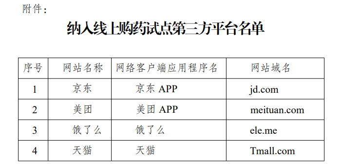 编辑说:日前,江苏省医保局发布通知,公布纳入医保线上购药试点第三方平台名单,京东、美团、饿了么、天猫四大平台在列。