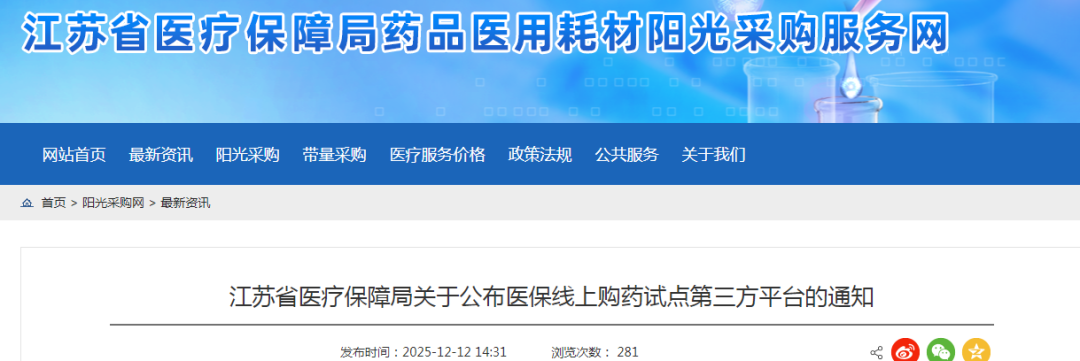 根据《关于开展医保线上购药试点工作的通知》(苏医保函〔2025〕109号)文件,现公布纳入医保线上购药试点第三方平台名单,具体名单见附件。