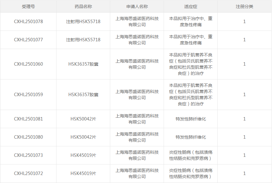 编辑说:近日,CDE官网显示,海思科子公司海思盛诺医药的4款化药1类新药获批临床,分别为注射用HSK55718(急性疼痛)、HSK36357胶囊(肌营养不良症)、HSK50042片(特发性肺纤维化)、HSK45019片(炎症性肠病)。米内网数据显示,2024年中国三大终端六大市场化药销售规模超10000亿元。