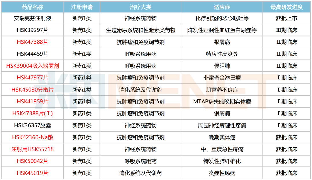 从最高研发进度上看,HSK39297片(阵发性睡眠性血红蛋白尿症)正处Ⅲ期临床试验阶段,HSK47388片(银屑病)、HSK44459片(特应性皮炎、白塞病、银屑病、肺纤维化)、HSK39004吸入粉雾剂(慢阻肺)均已步入Ⅱ期临床,上市可期。