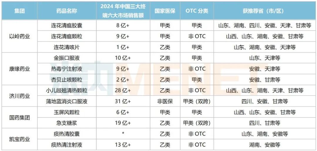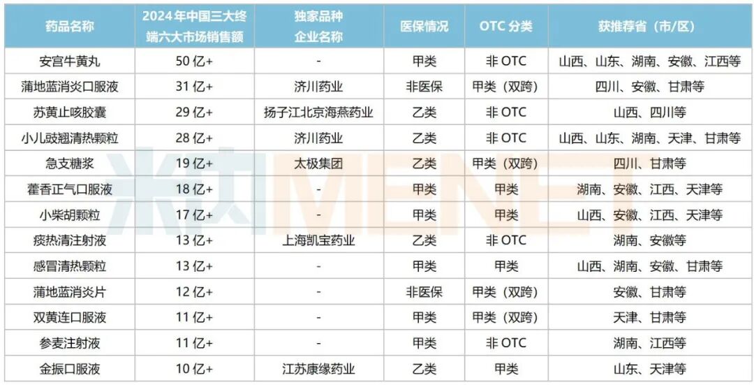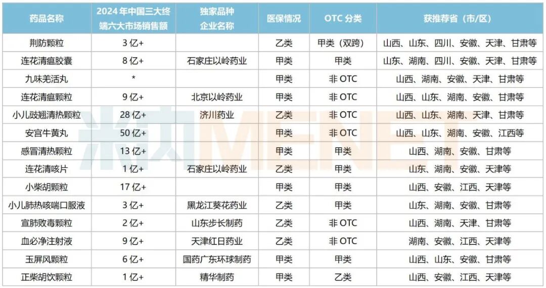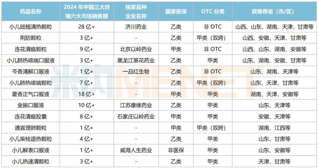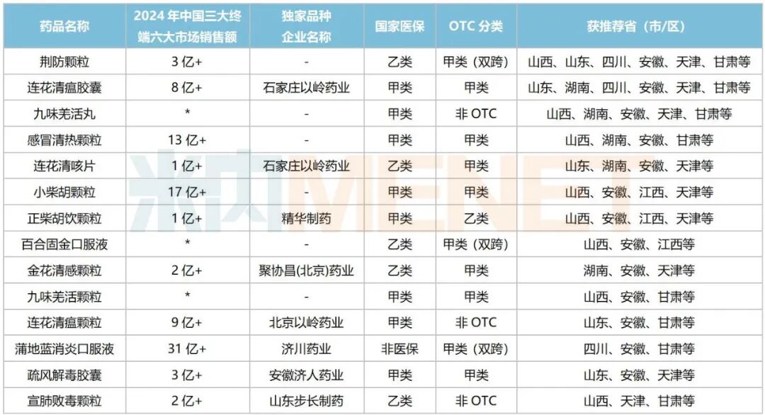 编辑说:近段时间,随着全国流感步入高发期,山西、山东、湖南、四川、安徽、江西、天津、甘肃等多个省(市/区)陆续发布流感/呼吸道疾病中医药防治方案。经梳理,获得2个及以上省(市/区)推荐的中成药有55个(25个为独家),2024年在中国三大终端六大市场(统计范围详见本文末)销售额合计超过410亿元,13个超10亿大品种领跑,以岭、康缘、国药、济川等有多个独家品种在列。