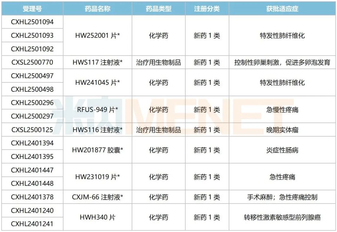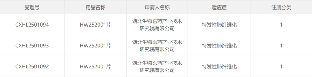 HW241045片的临床申请于2025年10月获得CDE承办受理,同年12月获得临床试验默示许可,用于治疗特发性肺纤维化(IPF)。