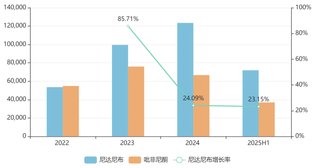 米内网数据显示,2024年中国三大终端六大市场(统计范围详见本文末)尼达尼布、吡非尼酮销售额分别超过12亿元、6亿元,2025年上半年分别超过7亿元、3亿元。其中,尼达尼布近年来销售额增速均达两位数。