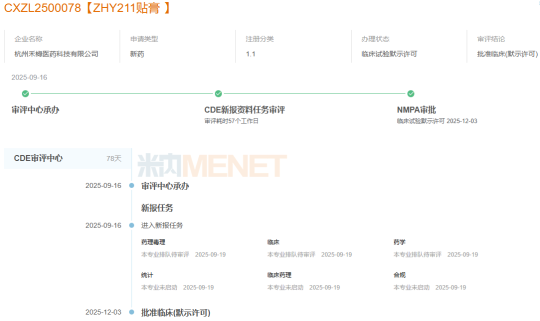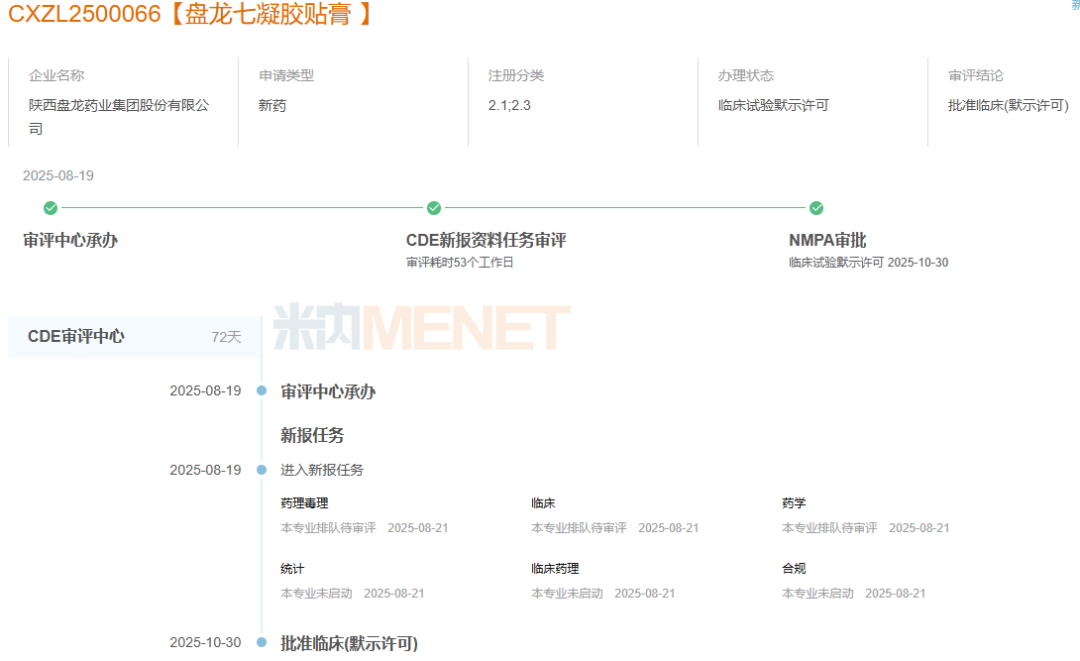 今年以来,中成药贴膏剂已有健民药业集团的中药1.1类新药小儿牛黄退热贴膏获批上市,湖南九典制药的中药1.1类新药椒七止痛凝胶贴膏报产在审,杭州禾橼医药的ZHY211贴膏、陕西盘龙药业的盘龙七凝胶贴膏获批临床。