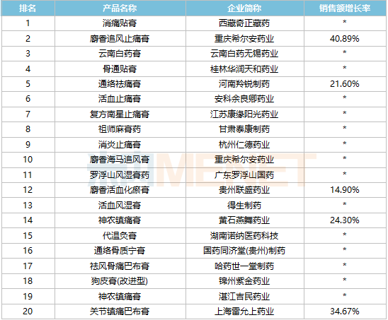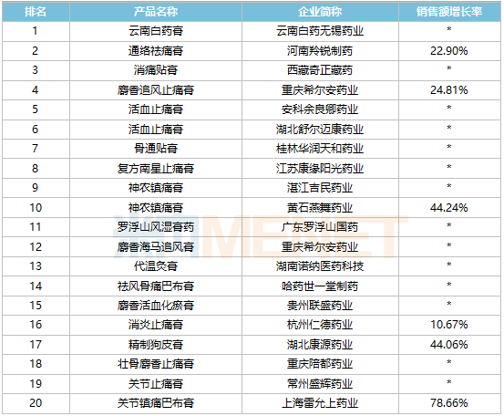 从品牌TOP20销售额来看,云南白药无锡药业的云南白药膏以超过6亿元领跑,河南羚锐制药的通络祛痛膏超过4亿元,西藏奇正藏药的消痛贴膏、重庆希尔安药业的麝香追风止痛膏均超过2亿元。此外,湖北康源药业的精制狗皮膏、上海雷允上药业的关节镇痛巴布膏均为新上榜品牌。