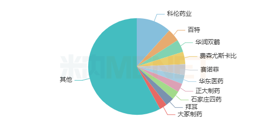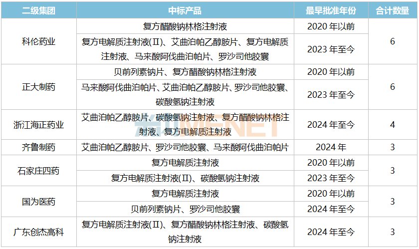 科伦药业和正大制药各有6个产品中标排在第一梯队,浙江海正药业4个产品中标排在第二梯队,齐鲁制药、石家庄四药、国为医药、广东创杰高科各有3个产品中标排在第三梯队。