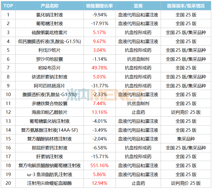 TOP14-TOP20产品的销售额均在7亿元以上,其中复方电解质醋酸钠葡萄糖注射液2025年Q1-Q3的增长率高达551.166%,是今年新上榜TOP20的产品,ω-3鱼油脂肪乳注射液排名上升了7位至TOP19,注射用尖吻蝮蛇血凝酶增长了12.94%,排名上升12位至TOP20。