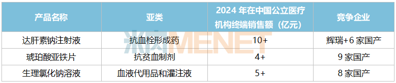 达肝素钠注射液是肝素类TOP4产品,2022-2024年在中国公立医疗机构终端的销售额均超过10亿元,目前该产品的竞争企业已达7家。值得注意的是,肝素类TOP1产品依诺肝素钠注射液和TOP2产品那屈肝素钙注射液已纳入了第八批集采。