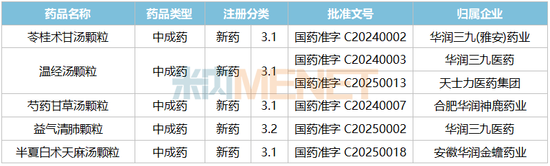 2024年3月,华润三九首个古代经典名方苓桂术甘汤颗粒顺利获批,集团随后陆续拿下了温经汤颗粒、芍药甘草汤颗粒、益气清肺颗粒,本次获批的半夏白术天麻汤颗粒是集团第5款古代经典名方(按产品名统计)。